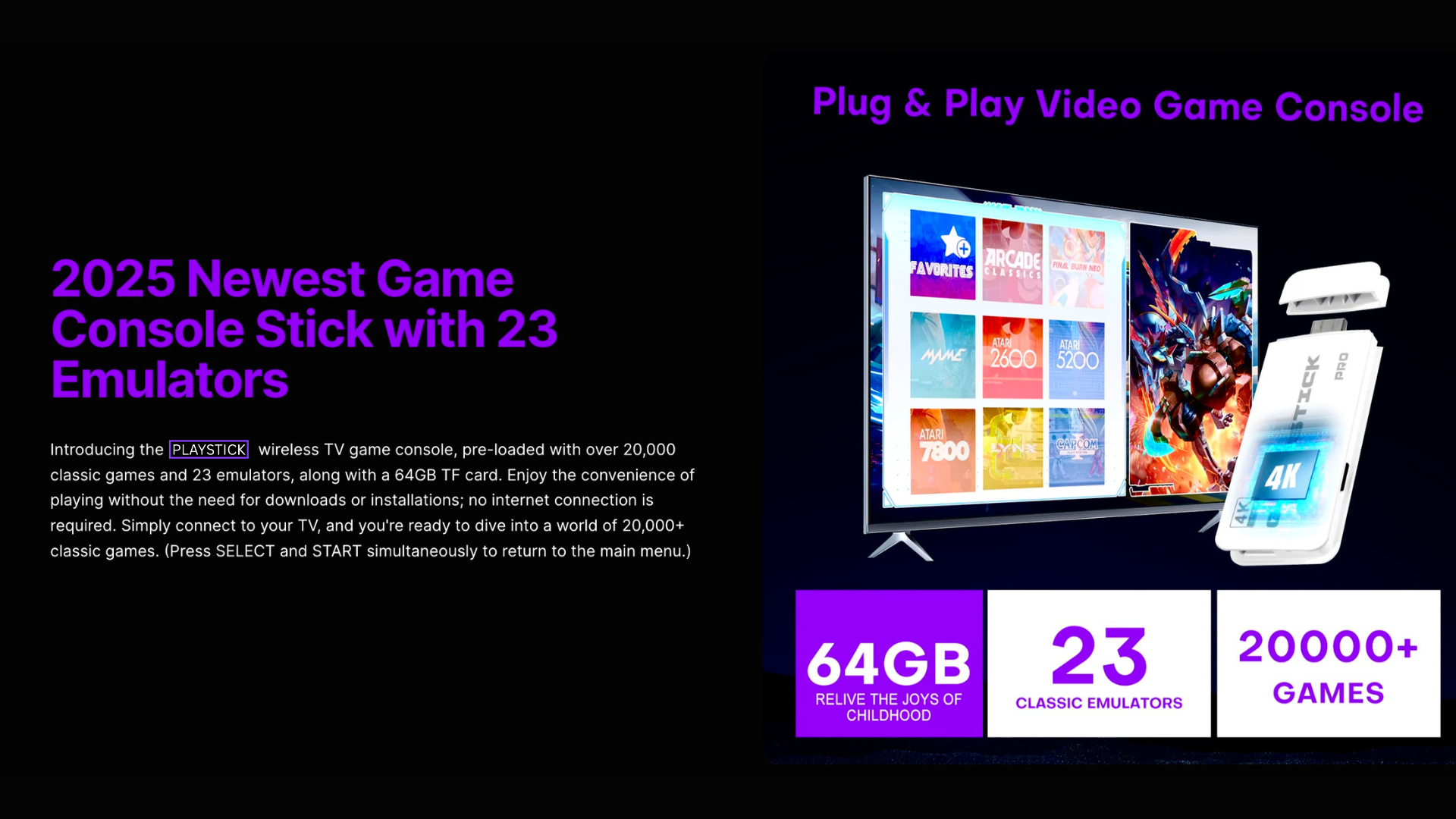 PLAYSTICK PRO Video Game Console delivers a thrilling gaming experience via 4K resolution support along with its 2.4G Dual Wireless Controllers featuring unique buttons that you’ll feel in every game, thanks to their unparalleled quality and sensitivity.