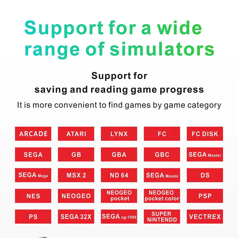Arcade, FinalBurn, MAME, Atari 2600, Atari 5200, Atari 7800, Atari Lynx, CPS-1, CPS-2, CPS-3 & more.